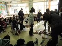 おもしろいお話とすてきな人形に、みんなくぎ付けです。ガチョウに次々人がくっついていくと、思わず「うわ!どこまで一緒に行くんよ!」「やばいやん・・・!」と声をあげるときわっ子たち。