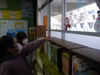 「1冊かりたら、1つ押してもらえるんよ。ぼく、もう2つたまった!」「全部たまったら、クリスマスツリーの飾りが完成するよ!」
