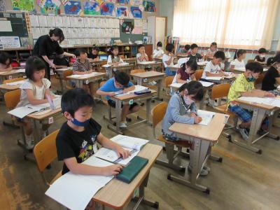 子どもたちのノートを見て回りました。指を使って考えている子、教科書の★マークの図を使って考えている子、式を立てて考えている子、頭の中で考えノートに答えを書き込んでいる子などなど、様々なスタイルで確認問題にチャレンジしていました。